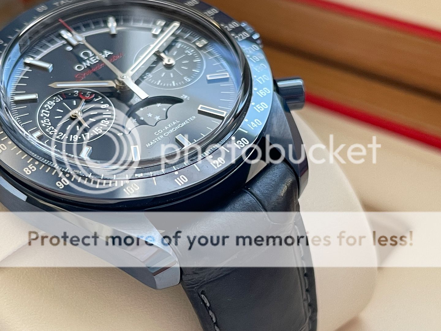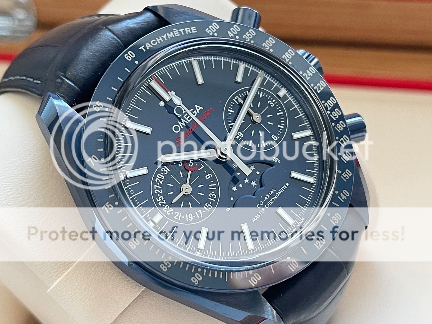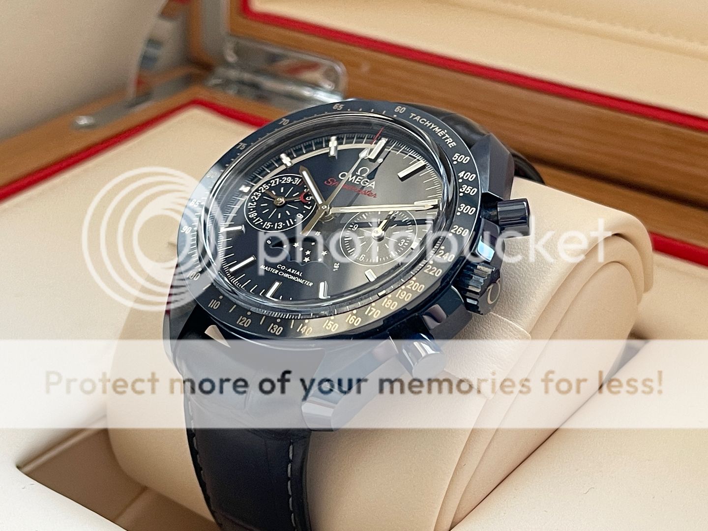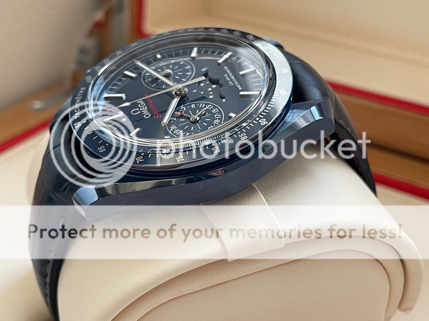 Up for sale is this Omega Speedmaster Moonphase in blue Ceramic also know as Blue Side of the Moon! That was purchased in March 2018 from Canadian AD and still has balance of manufacturing warranty (5 years)! Watch is in pristine condition being a ceramic watch there is no marks, swirls or dents of any kind! The strap is very good condition, its been worn but carefully in rotation. Watch is featuring a 44.25mm case which sits super comfortable on my 6.75 inch wrist being on a leather strap! This Omega has a 9904 movement which features a moon-phase complication, "Self-winding chronograph with column wheel and Co- Axial escapement. Certified Master Chronometer, approved by METAS, resistant to magnetic fields reaching 15,000 gauss. Silicon balance-spring, 2 barrels mounted in series. Central hour, minute and chronograph seconds hands, small seconds hand, date indication by hand, 12- hour and 60-minute recorders and moonphase indication. Rhodium plated finish with Geneva waves in arabesque. The blue ceramic dial includes 18K white gold indexes and hands. At 6 o'clock is the accurate Moonphase indication, which features a blue ceramic moonphase disc with near and far sides of the moon in LiquidMetal™."- www.omegawatches.com