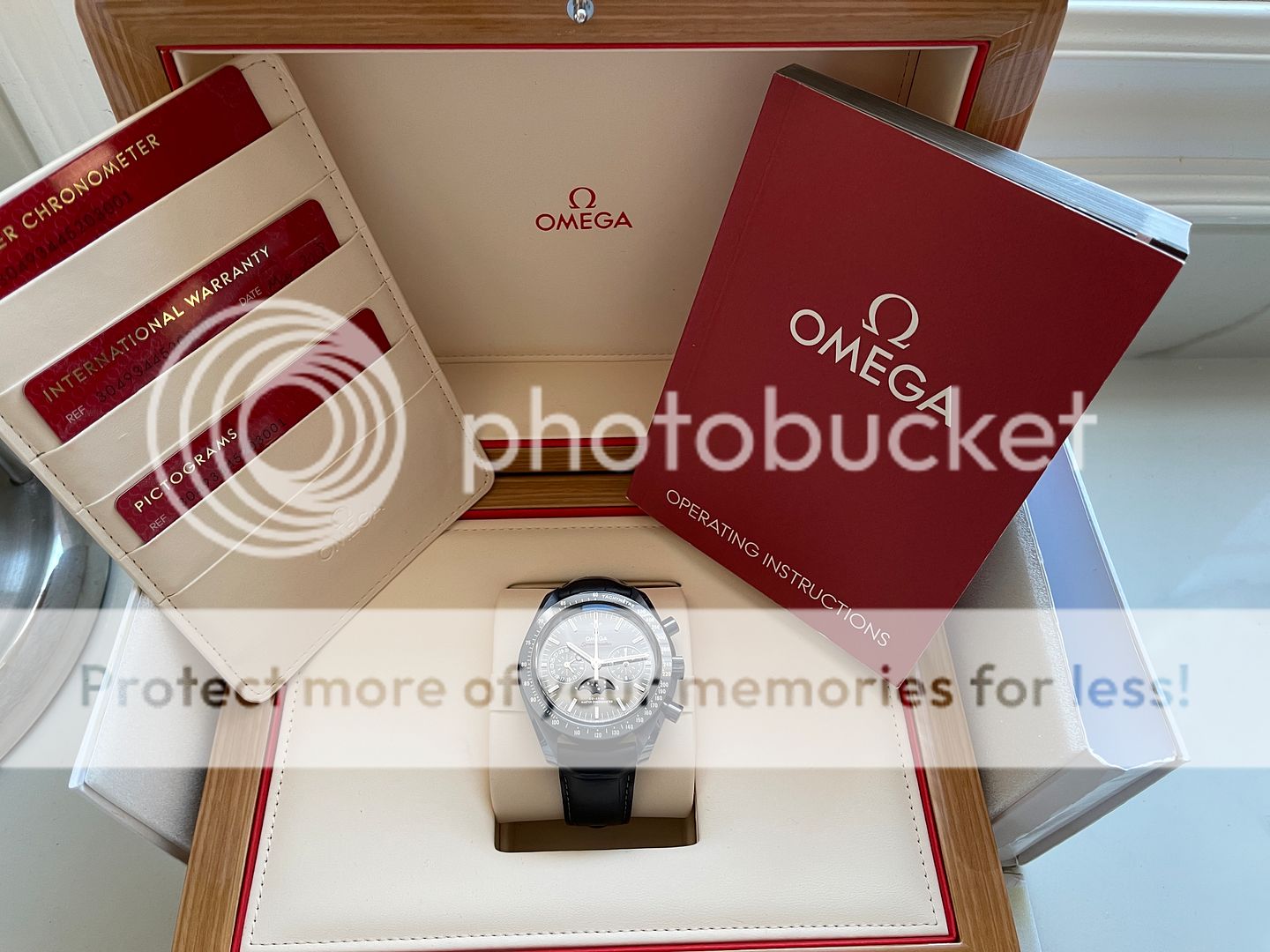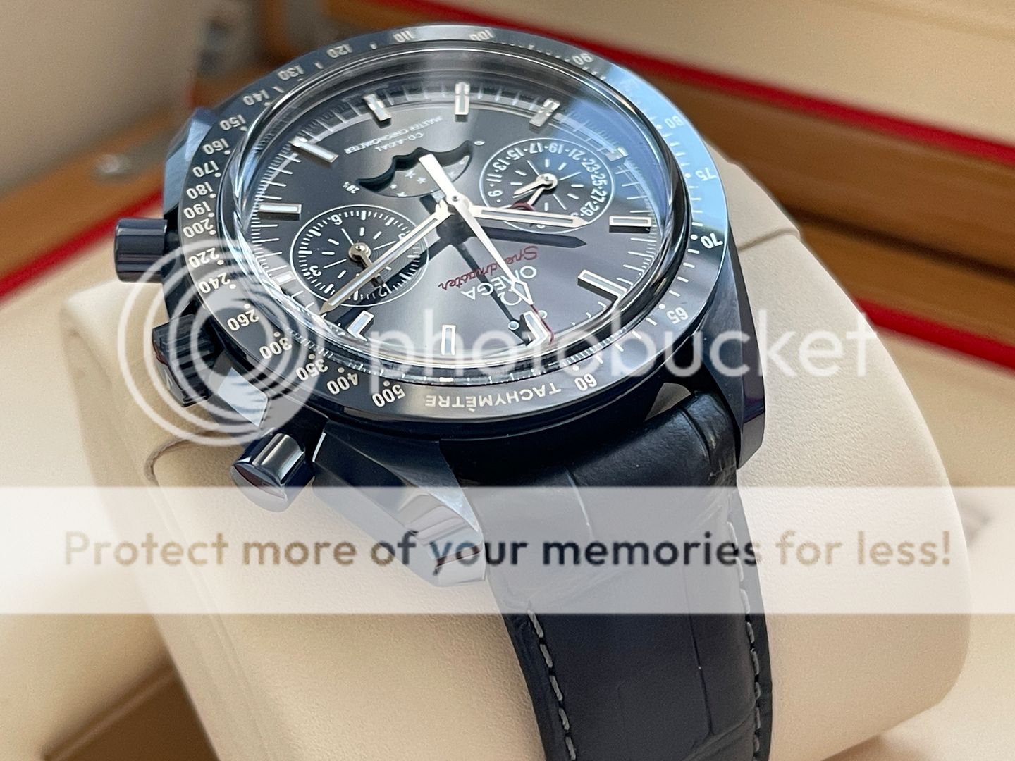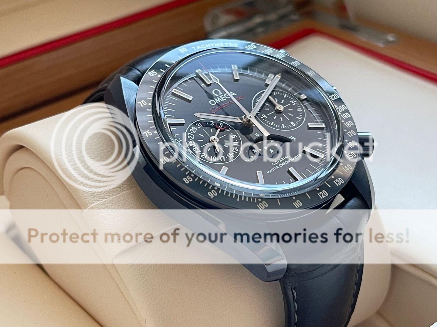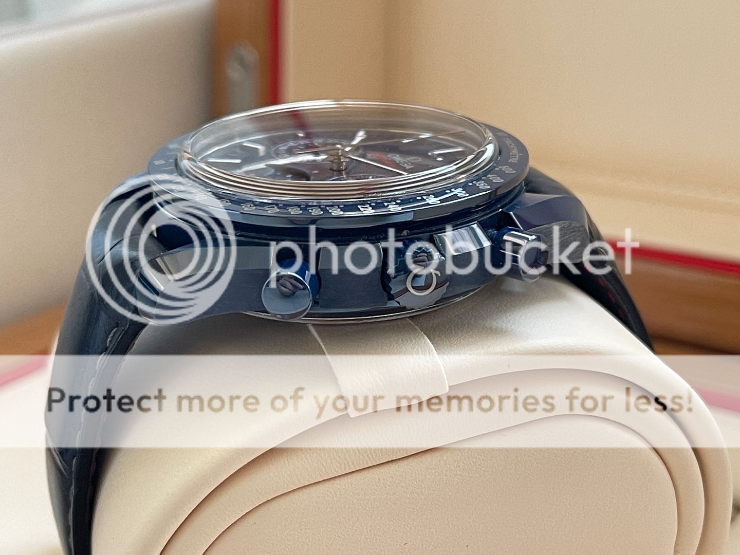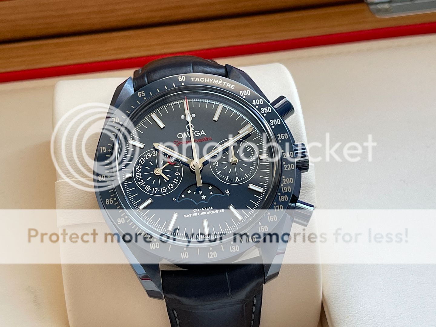 Up for sale is this Omega Speedmaster Moonphase in blue Ceramic also know as Blue Side of the Moon! That was purchased in March 2018 from Canadian AD and still has balance of manufacturing warranty (5 years)! Watch is in pristine condition being a ceramic watch there is no marks, swirls or dents of any kind! The strap is very good condition, its been worn but carefully in rotation. Watch is featuring a 44.25mm case which sits super comfortable on my 6.75 inch wrist being on a leather strap! This Omega has a 9904 movement which features a moon-phase complication, "Self-winding chronograph with column wheel and Co- Axial escapement. Certified Master Chronometer, approved by METAS, resistant to magnetic fields reaching 15,000 gauss. Silicon balance-spring, 2 barrels mounted in series. Central hour, minute and chronograph seconds hands, small seconds hand, date indication by hand, 12- hour and 60-minute recorders and moonphase indication. Rhodium plated finish with Geneva waves in arabesque. The blue ceramic dial includes 18K white gold indexes and hands. At 6 o'clock is the accurate Moonphase indication, which features a blue ceramic moonphase disc with near and far sides of the moon in LiquidMetal™."- www.omegawatches.com
