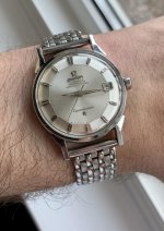 Offered for sale is an iconic and original vintage Omega Constellation with a pie pan dial and dog leg lugs. This particular watch dates back to ~1965/6.